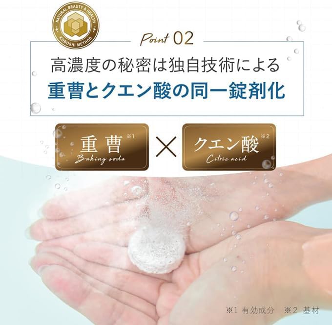 ホットタブは「重炭酸温浴法」に欠かせない重炭酸イオンを生み出す、重曹とクエン酸(※3)を錠剤化した独自製法の入浴剤です。微細な炭酸ガスの泡が継続的に吹き出し、お湯の中で重炭酸イオンと水素イオンに乖離。長時間濃度が持続するため、後から追い焚きすれば翌日までご家族全員でお楽しみいただけます。