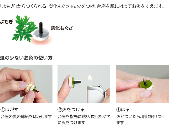 よもぎを炭化することで、「せんねん灸オフシリーズ」(当社従来品)に比べ煙の少ないお灸です。